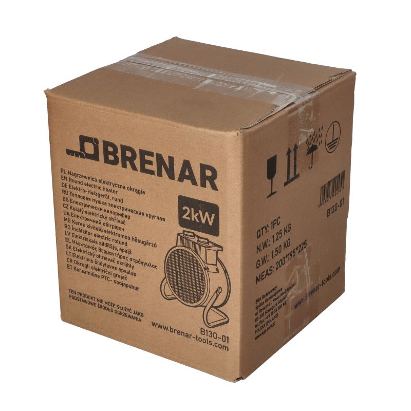 BRENAR nagrzewnica elektryczna okrągła 2kW to kompaktowe, ale wydajne urządzenie, które sprawdzi się w pomieszczeniach zamkniętych, takich jak garaże, piwnice, warsztaty czy pomieszczenia użytkowe. Dzięki termostatowi i funkcji wentylacji bez ogrzewania, zapewnia komfortowe i ekonomiczne użytkowanie.