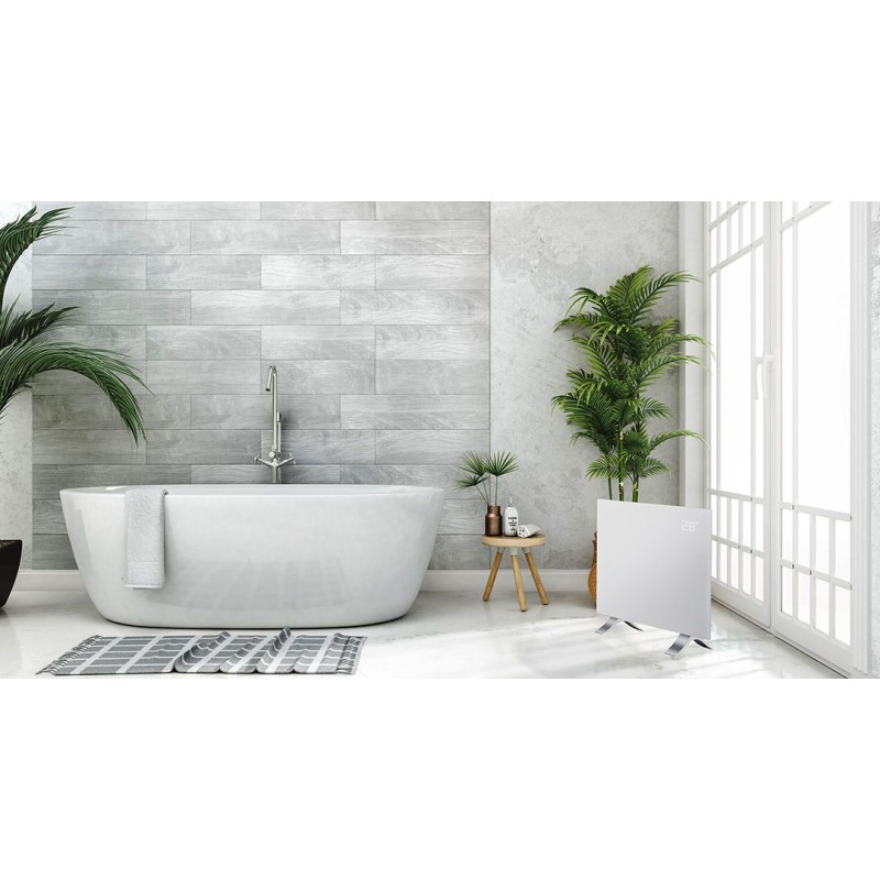 Produkt wyróżnia się nowoczesnym i eleganckim designem. Został wykonany z hartowanego szkła o wysokiej wytrzymałości. Aluminiowy system grzewczy nowej generacji, pracuje bez hałasu, bez zapachu, gazu lub dymu. Ciepło odczuwane jest natychmiast po włączeniu konwektora. Dotykowy ekran LED jest prosty i intuicyjny w obsłudze. Urządzenie wyposażone zostało w precyzyjny termostat z regulacją temperatury w zakresie 5-45°C. Pilot zdalnego sterowania ułatwia programowanie trybu pracy. Program tygodniowy w urządzeniu może byś sterowany zarówno pilotem jak i panelem dotykowym. Grzejnik posiada zabezpieczenie przed przegrzaniem, zabezpieczenie przed przewróceniem oraz zabezpieczenie przed dziećmi, co wpływa na bezpieczne użytkowanie. Produkt posiada funkcję antyzamarzaniową, która ma na celu utrzymanie minimalnej temperatury w pomieszczeniu oraz funkcję wykrywania otwartych okien. Grzejnik można postawić na podłodze lub zamontować na ścianie - w komplecie znajdują się aluminiowe nóżki oraz zestaw do montażu ściennego. Produkt współpracuje z aplikacją TUYA APP, która umożliwia tygodniowe zaprogramowanie pracy urządzenia. Dokładne zaplanowanie temperatur przekłada się na ekonomiczne wykorzystanie energii. Panel dotykowy daje możliwość zaprogramowania na 24h. Ten produkt jest odpowiedni tylko do sporadycznego użytku lub do stosowania w dobrze izolowanych pomieszczeniach.
