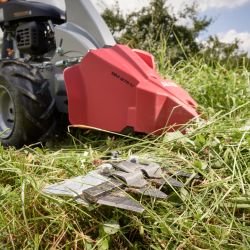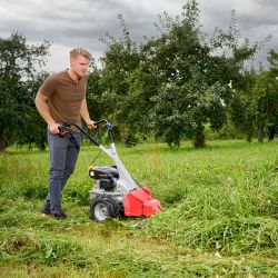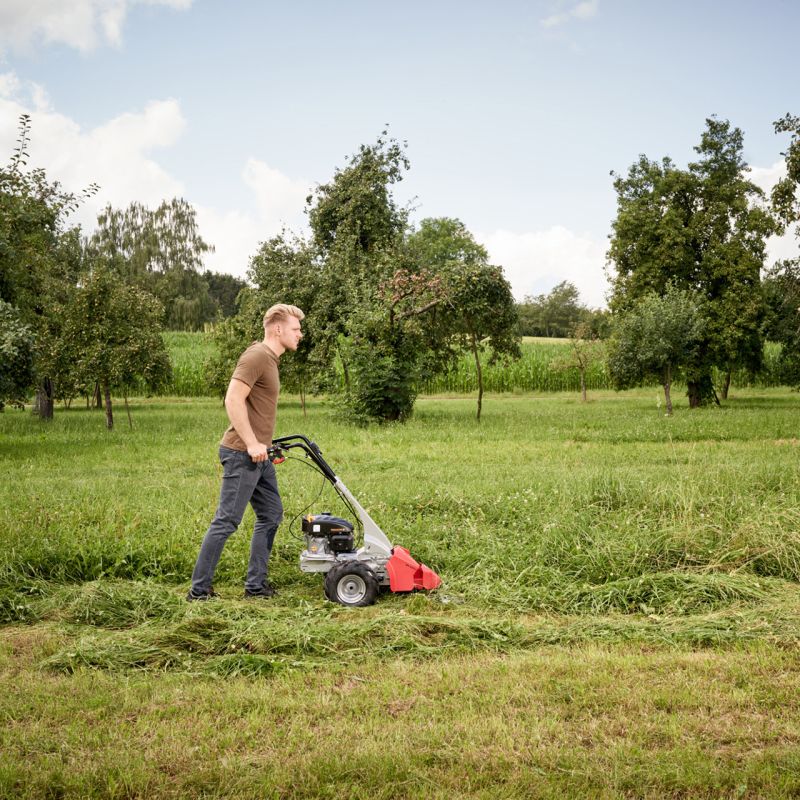 Napędzana wydajnym silnikiem spalinowym o mocy 2,7 kW i wyposażona w napęd na koła, kosiarka zapewnia szybkie i skuteczne koszenie na szerokości 87 cm. Bez problemu radzi sobie z wysokimi trawami, gęstymi zaroślami, nierównym terenem i pochyłościami. Zwrotność urządzenia, kompaktowa konstrukcja, duże szerokie koła z bieżnikiem terenowym oraz ergonomiczny, regulowany na wysokość i tłumiący drgania uchwyt prowadzący zapewniają komfort pracy i precyzyjne manewrowanie nawet przy krawędziach łąk i granicach pól.