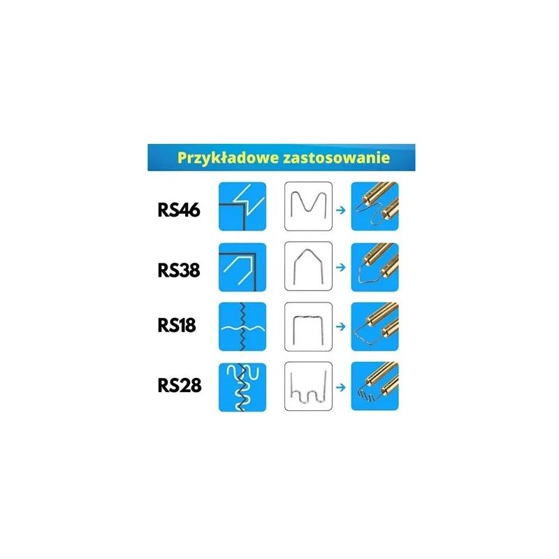 W komplecie razem ze zgrzewarką dostępne są zszywki o zróżnicowanych kształtach i grubościach, co pozwala na łączenie różnorodnych powierzchni, takich jak narożniki zewnętrzne czy wewnętrzne, a także powierzchnie płaskie.